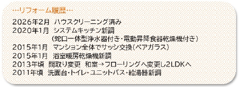 | 特色 | 都市ガス、角部屋、最上階、南バルコニー、エレベーター、宅配ボックス、給湯、食器洗浄乾燥機、ビルトイン浄水器、温水洗浄便座、浴室暖房乾燥機、リフォーム履歴あり、空家、即入居可、契約不適合責任免除 | ||