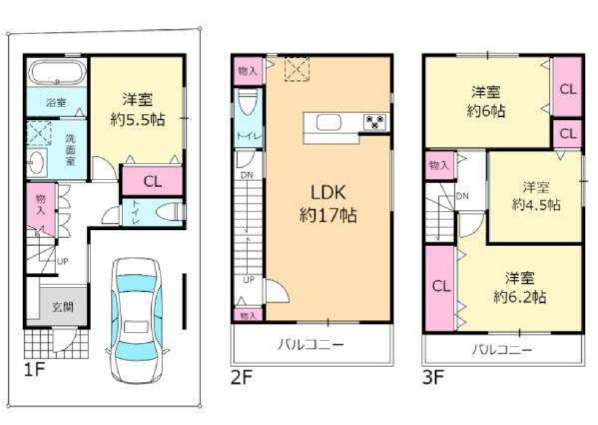 | 間取詳細 | (1階)洋5.5、(2階)LDK17、(3階)洋6.2、洋6、洋4.5 |
