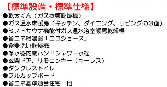 | 特色 | 駐車場、公営水道、公共本下水、都市ガス、準防火地区、ペアガラス、給湯、食器洗浄乾燥機、浴室暖房乾燥機、温水洗浄便座、2階トイレあり、カラーモニター付インターフォン、空家、即入居可 |