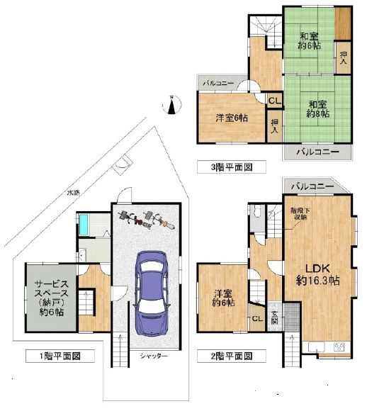 | 間取詳細 | (1階)納戸6、(2階)LDK16.3、洋6、(3階)洋6、和8、和6 |