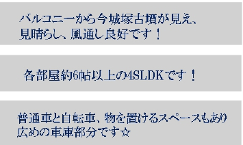 | 特色 | 駐車場、公営水道、公共本下水、都市ガス、準防火地区、南道路、全居室6帖以上、給湯、温水洗浄便座、カラーモニター付インターフォン、リフォーム履歴あり、空家、即入居可 |