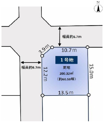 | 特色 | 建築条件なし、公営水道、公共本下水、都市ガス、電気、高低差なし、角地、前面道路幅員6.7m、更地、引渡し即 |