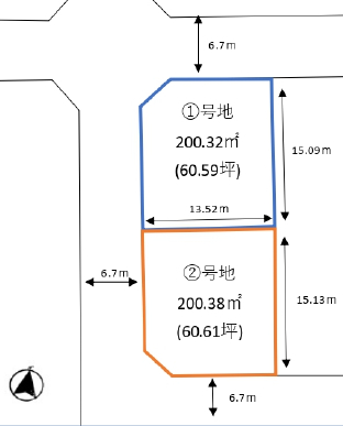 2区画の北側です。北西の角地で土地面積:約60.59坪あります。現況更地で建築条件はありませんので、お好きな建築ができます。