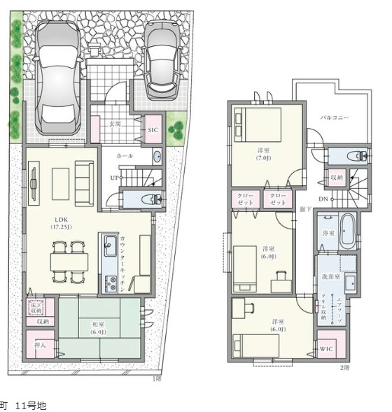 14区画の分譲地・2025年7月完成です。建物面積:114.31㎡・4LDKの間取りで、バスルームが2階になります。ガレージ2台駐車可能です。