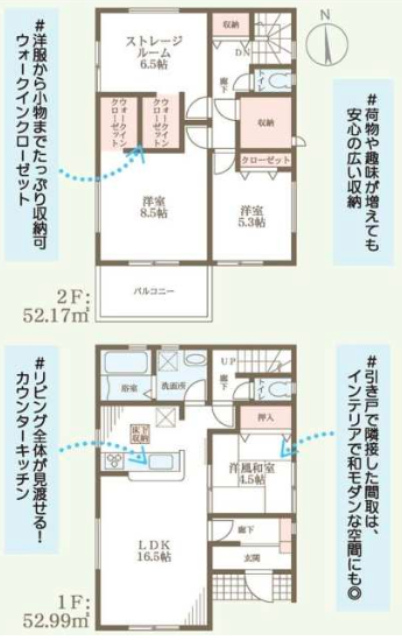 間取詳細 | (1階)LDK16.5、和4.5、(2階)洋8.6、洋6.3、S6.5 |