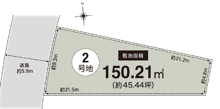 | 特色 | 建築条件なし、公営水道、公共本下水、都市ガス、電気、高低差なし、前面道路幅員5.9m、更地、引渡し即 |