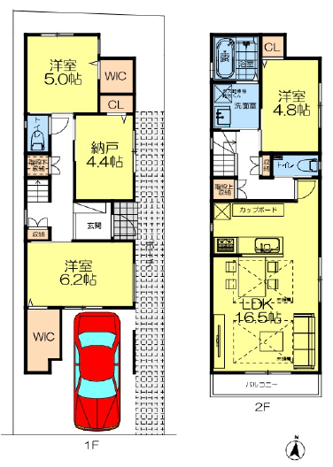| 間取詳細 | (1階)洋6.2、洋5、納戸4.4、(2階)LDK16.5、洋4.8 |
