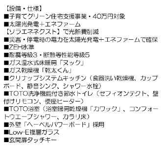 | 特色 | 駐車場、公営水道、公共本下水、都市ガス、南道路、ペアガラス、給湯、食器洗浄乾燥機、床暖房、浴室暖房乾燥機、温水洗浄便座、2階トイレあり、カラーモニター付インターフォン、ウォークインクローゼット、空家 |