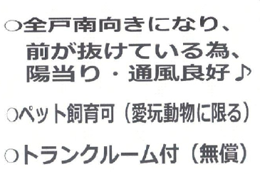 | 特色 | 都市ガス、二階以上、南バルコニー、エレベーター、トランクルーム、給湯 |
