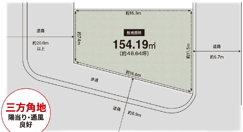 | 接道 | 東 8.9m(幅員) 公道 位置指定無 16.6m(接面) 南 20m(幅員) 公道 7.4m(接面) 北 6.7m(幅員) 公道 11.5m(接面) |