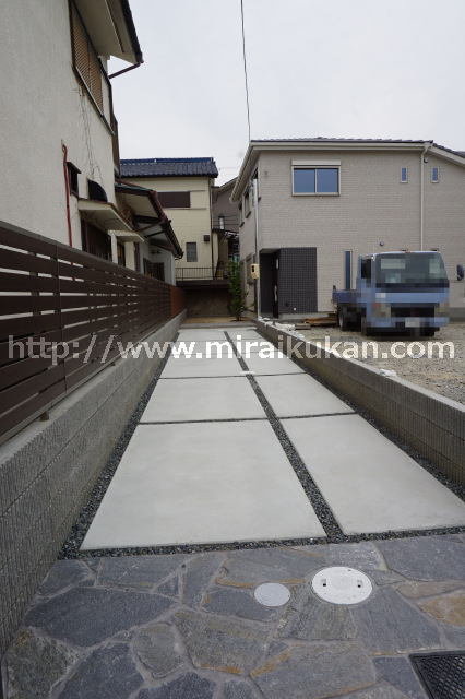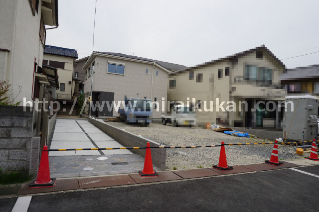 専用通路の旗竿地です。2024年3月完成・新築未入居です。118.1㎡・3LDK+2納戸の間取りで、ガレージ3台駐車可能です。