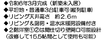 | 特色 | 駐車場、公営水道、公共本下水、都市ガス、前面道路幅員16.2m、ペアガラス、給湯、食器洗浄乾燥機、床暖房、浴室暖房乾燥機、温水洗浄便座、2階トイレあり、納戸、カラーモニター付インターフォン、空家、即入居可 |