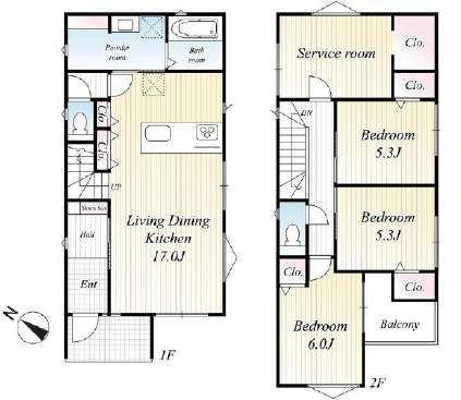 | 間取詳細 | (1階)LDK17、(2階)洋6、洋5.3、洋5.3、S |