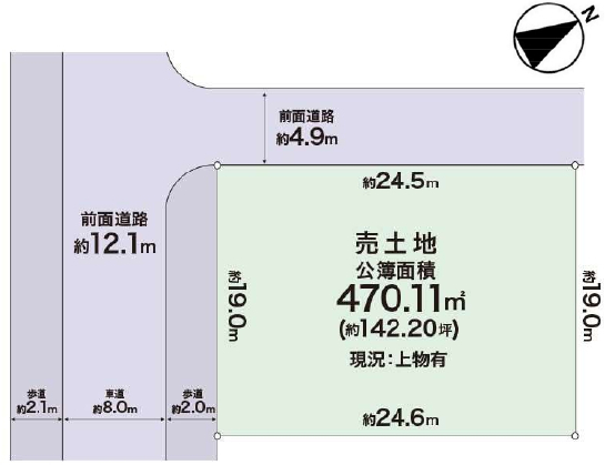 | 接道 | 南 12.1m(幅員) 公道 19m(接面) 西 4.9m(幅員) 公道 24.5m(接面) |