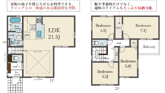 | 間取詳細 | (1階)LDK21.5、(2階)洋7.1、洋5.2、洋5、洋4.5 |