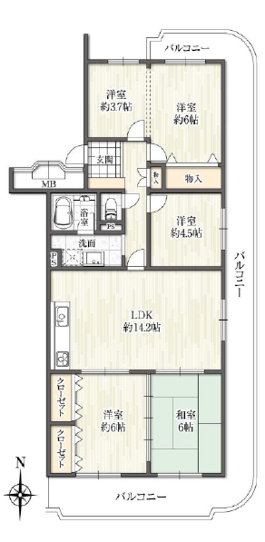 | 間取詳細 | LDK14.2、洋6、洋6、洋4.5、洋3.7、和6 |