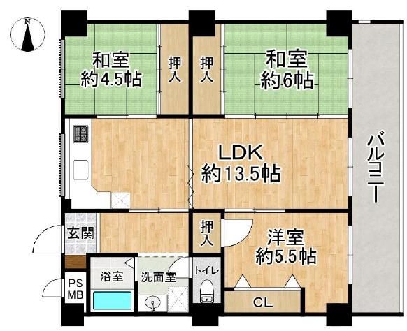 | 間取詳細 | LDK13.5、和6、和4.5、洋5.5 |