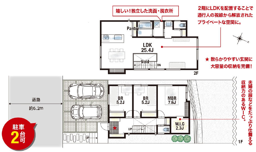 | 間取詳細 | (1階)洋7.6、洋5.2、洋5.2、(2階)LDK25.4 |