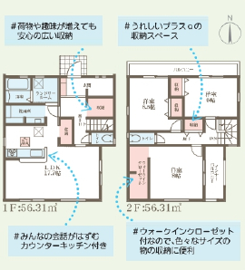 | 特色 | 駐車場、公営水道、公共本下水、都市ガス、ペアガラス、給湯、浴室暖房乾燥機、温水洗浄便座、2階トイレあり、ウォークインクローゼット、床下収納庫、カラーモニター付インターフォン |