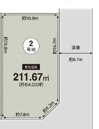 | 接道 | 南東 6.2m(幅員) 公道 7.8m(接面) 北東 6.1m(幅員) 公道 16.7m(接面) |