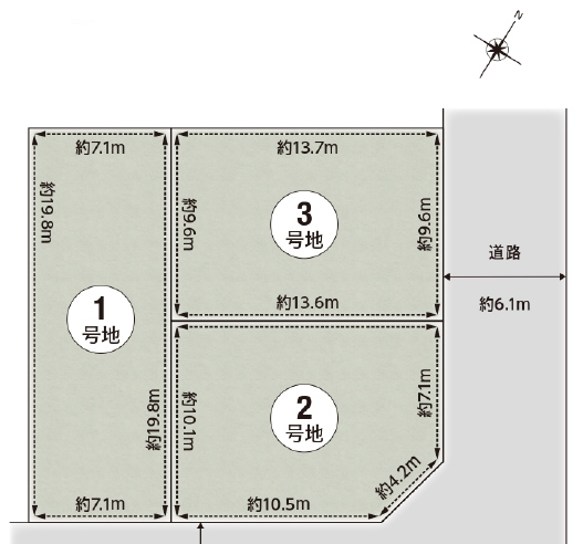 | 特色 | 建築条件なし、公営水道、公共本下水、都市ガス、電気、南道路、高低差なし、前面道路幅員6m、更地、引渡し即 |