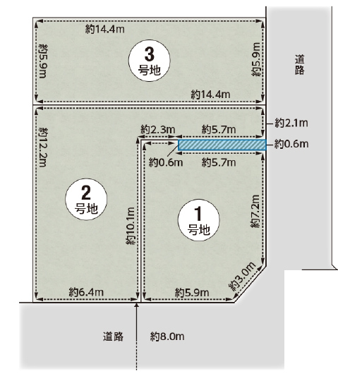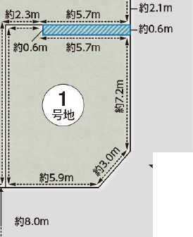 | 接道 | 南東 8m(幅員) 公道 5.9m(接面) 北東 4m(幅員) 公道 7.2m(接面) |