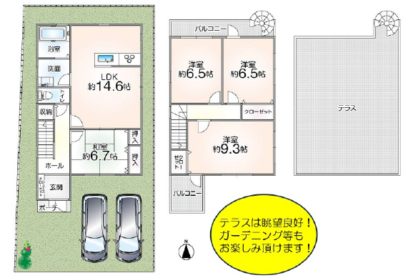 | 間取詳細 | (1階)LDK14.6、和6.7、(2階)洋9、洋6.5、洋6.5 |